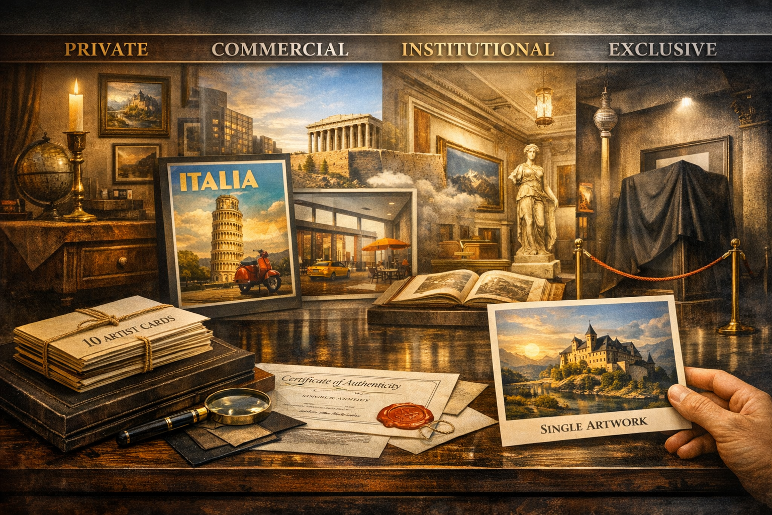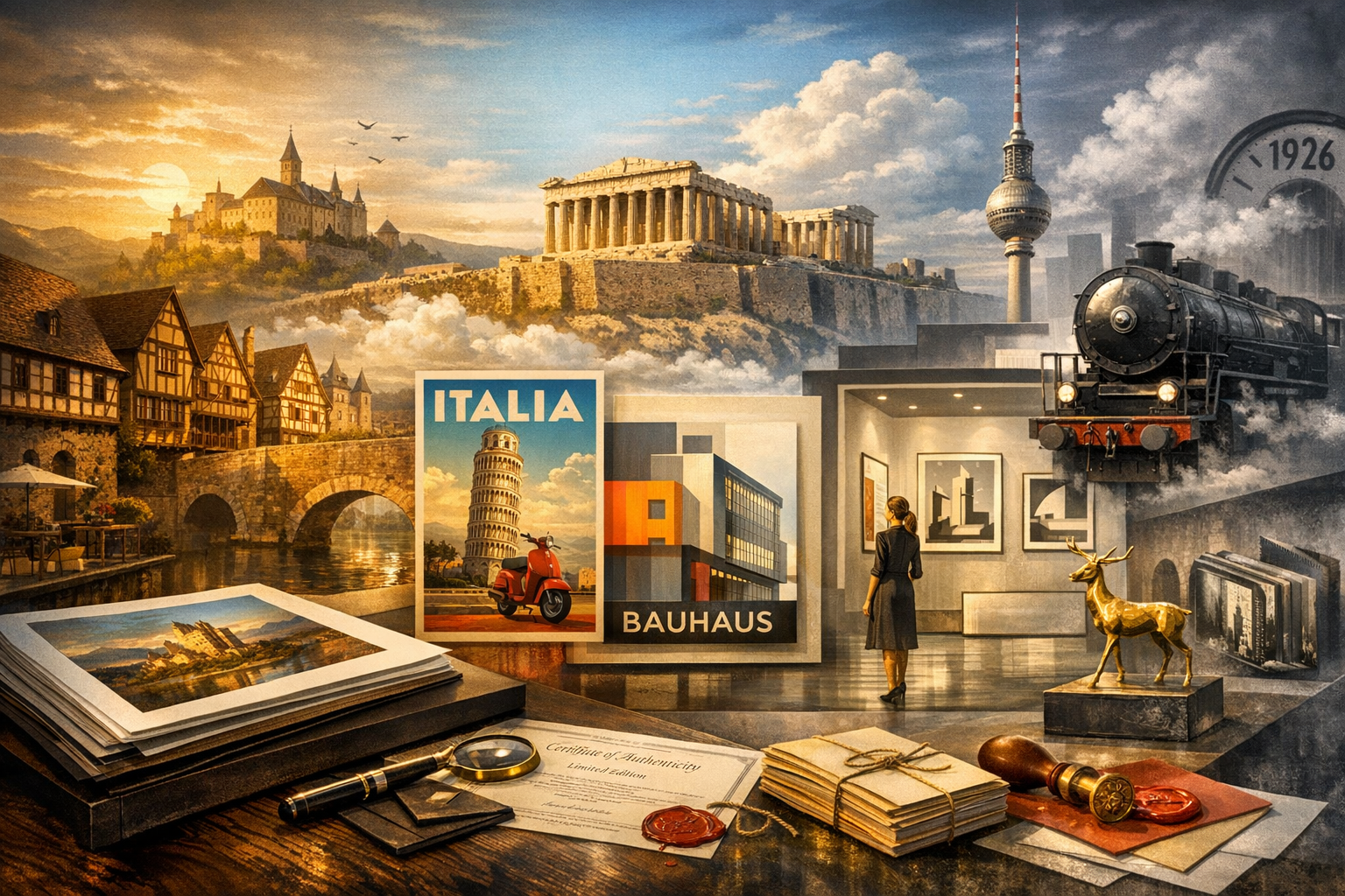Jede Edition — ob digitale Künstlerkarte, kuratierte UNESCO‑Reihe, Retro‑Poster‑Serie oder physische Fine‑Art‑Print — besitzt ihren eigenen Charakter. Jede Lizenz — privat, kommerziell, professionell, institutionell oder exklusiv — definiert einen präzisen Rahmen für die Nutzung. Und jeder Preis markiert eine bewusste Entscheidung: für Sammlerwert, für Sichtbarkeit, für Exklusivität.