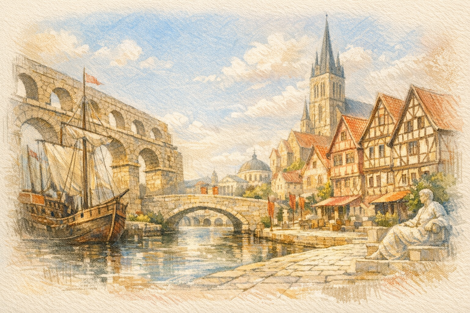 Das Mittelalter prägt Deutschlands Städte wie kaum eine andere Epoche: Fachwerk, Marktplätze, Stadtmauern, Kirchen und die Hanse. Diese Epoche ist reich an Struktur, Rhythmus und ikonischen Silhouetten – ideal für starke grafische Stile.