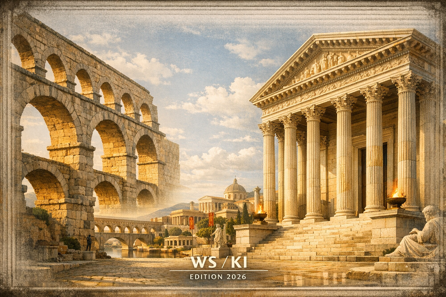 Die Antike steht für Ordnung, Macht, Ingenieurskunst und die ersten großen urbanen Zentren Europas. Römische Architektur ist klar, monumental und technisch präzise – ein ideales Feld für starke visuelle Interpretationen.