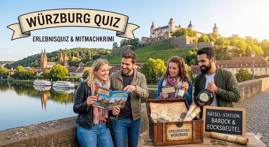 Lust auf mehr Barock und Wein? Würzburg ist ein Erlebnis für alle Sinne. Ob eine Führung durch den Staatlichen Hofkeller oder ein Picknick am Mainufer – die Stadt bietet unzählige Überraschungen. Nutzt dieses Würzburg Quiz und den Mitmachkrimi, um die Stadt mal ganz anders zu entdecken. Packt eure Freunde ein und werdet zu echten Würzburg-Experten!